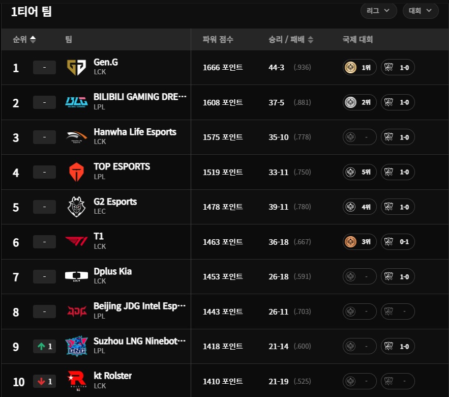 그 뒤를 이어 BLG와 HLE가 각각 2위, 3위를 차지하고 있습니다.